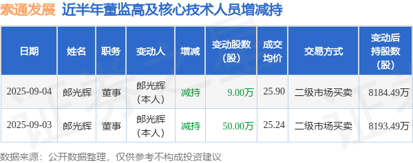 证券之星消息优配中国,根据9月5日市场公开信息、上市公司公告及交易所披露数据整理,索通发展(603612)最新董监高及相关人员股份变动情况:2025年9月3日至2025年9月4日公司董事郎光辉共减持公司股份59.0万股,占公司总股本为0.1185%。变动期间公司股价上涨0.6%,9月4日当日收盘报25.29元。