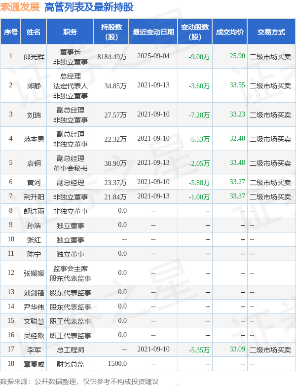 索通发展近半年内的董监高及核心技术人员增减持详情如下: